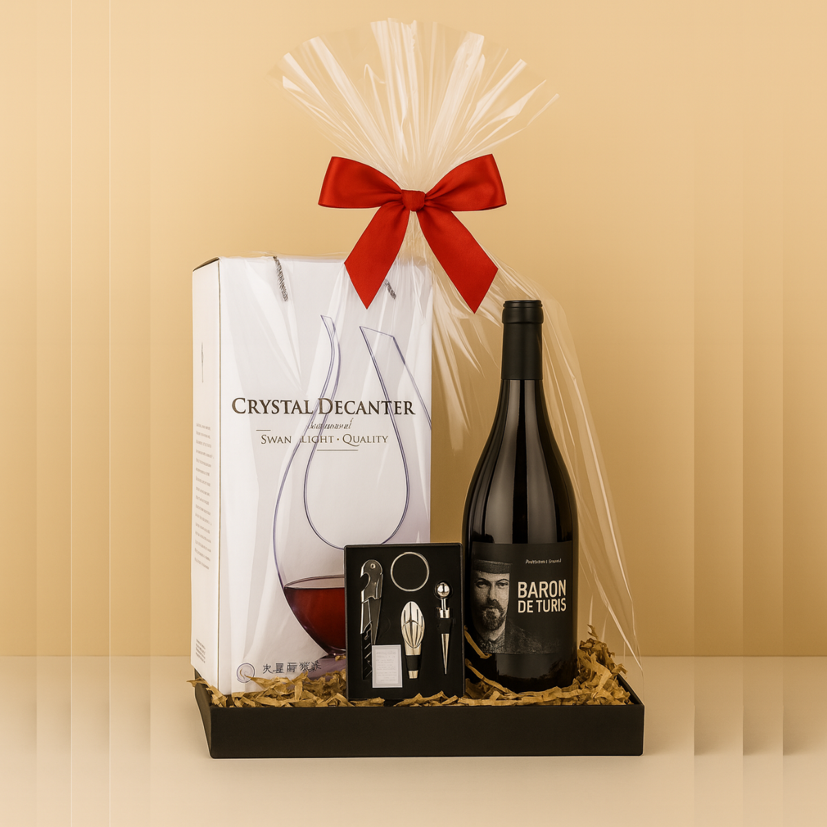 - 1 Set de 4 accesorios para vino : sacacorcho, vertedor, cortagotas, cortasellos.