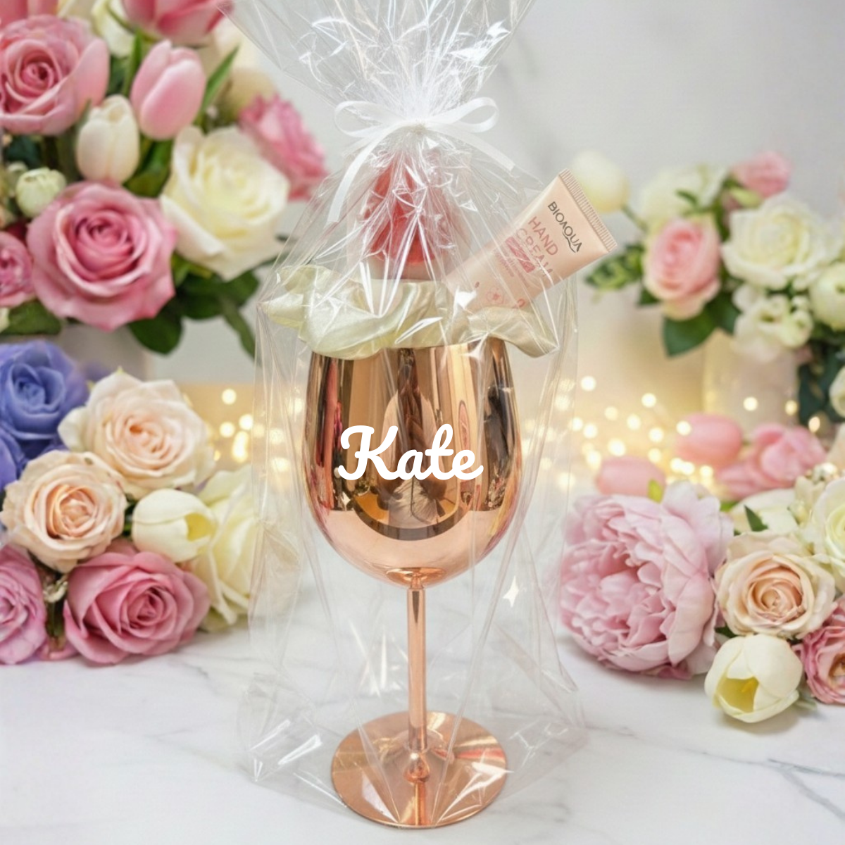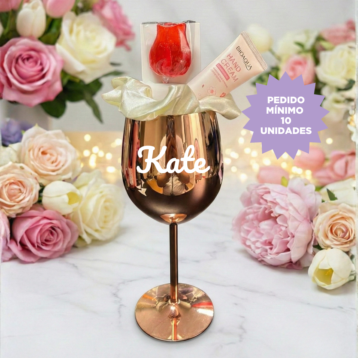 1 Copa de Acero Inoxidable. Color: Plateado y Rosegold. Personalizado con nombre o logo